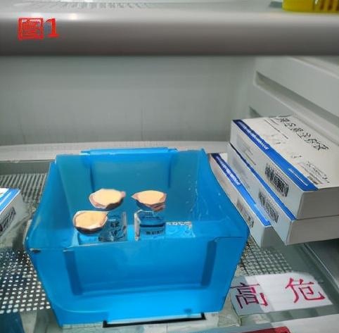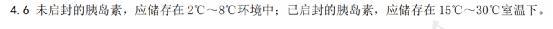 图1中未开封的胰岛素及使用中的胰岛素均放置在冰箱内,根据中华护理学会团体标准T/CNAS21-2021胰岛素皮下注射,规定未启封的胰岛素,应储存在 2℃~8℃境中;已启封胰岛素,应储存在 15℃~30℃室温下。由此可见,图1中蓝盒内开启使用中的胰岛素不需放到冰箱内,放置于常温下即可。