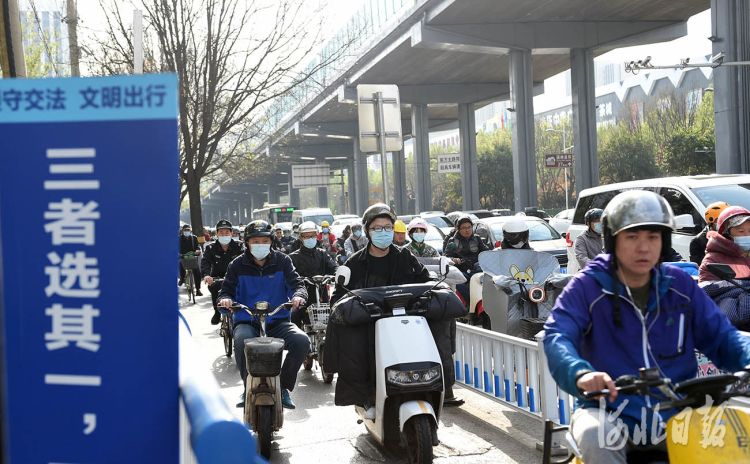 电动自行车驾乘人员佩戴安全头盔问题,是各地在城市管理中难啃的“硬骨头”。据公安部调查数据显示,摩托车、电动自行车驾乘人员死亡事故中约80%为颅脑损伤致死。而正确佩戴安全头盔可使交通事故的死亡风险和重伤风险实现大幅降低。2021年11月23日,《河北省电动自行车管理条例》正式出台,将于今年5月1日开始施行。其中明确规定:“驾驶、乘坐电动自行车应当佩戴安全头盔,未佩戴安全头盔的,则由公安机关交通管理部门给予口头警告,责令改正,甚至给予处罚。”为净化城市交通环境,引导群众文明出行,从2021年12月至2022年5月底,石家庄市利用6个月时间在市区集中开展电动车综合治理专项行动,教育引导广大市民形成骑行佩戴头盔的良好习惯,切实保障自身安全。随着整治行动不断推进,近日,记者在石家庄市街头发现,电动自行车骑乘人员佩戴安全头盔的明显增多。河北日报记者 赵永辉摄影报道