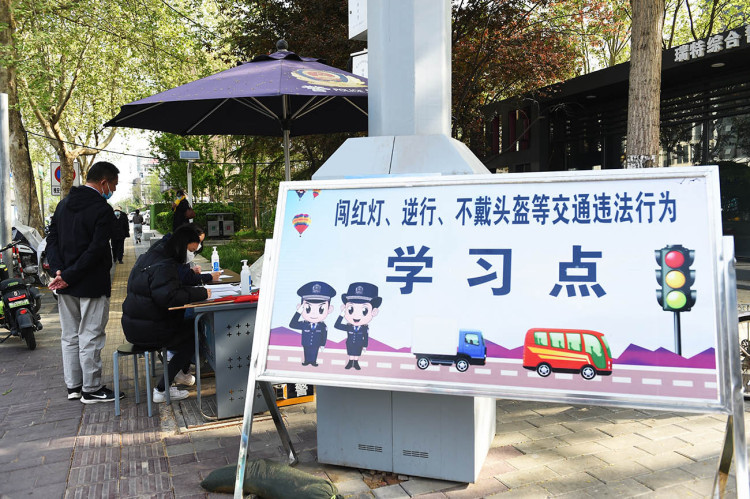 2022年4月13日早晨,在河北省石家庄市中华南大街与槐安西路交口交通违法学习点,未佩戴安全头盔驾驶电动自行车的市民在抄写安全教育法规。河北日报记者 赵永辉摄