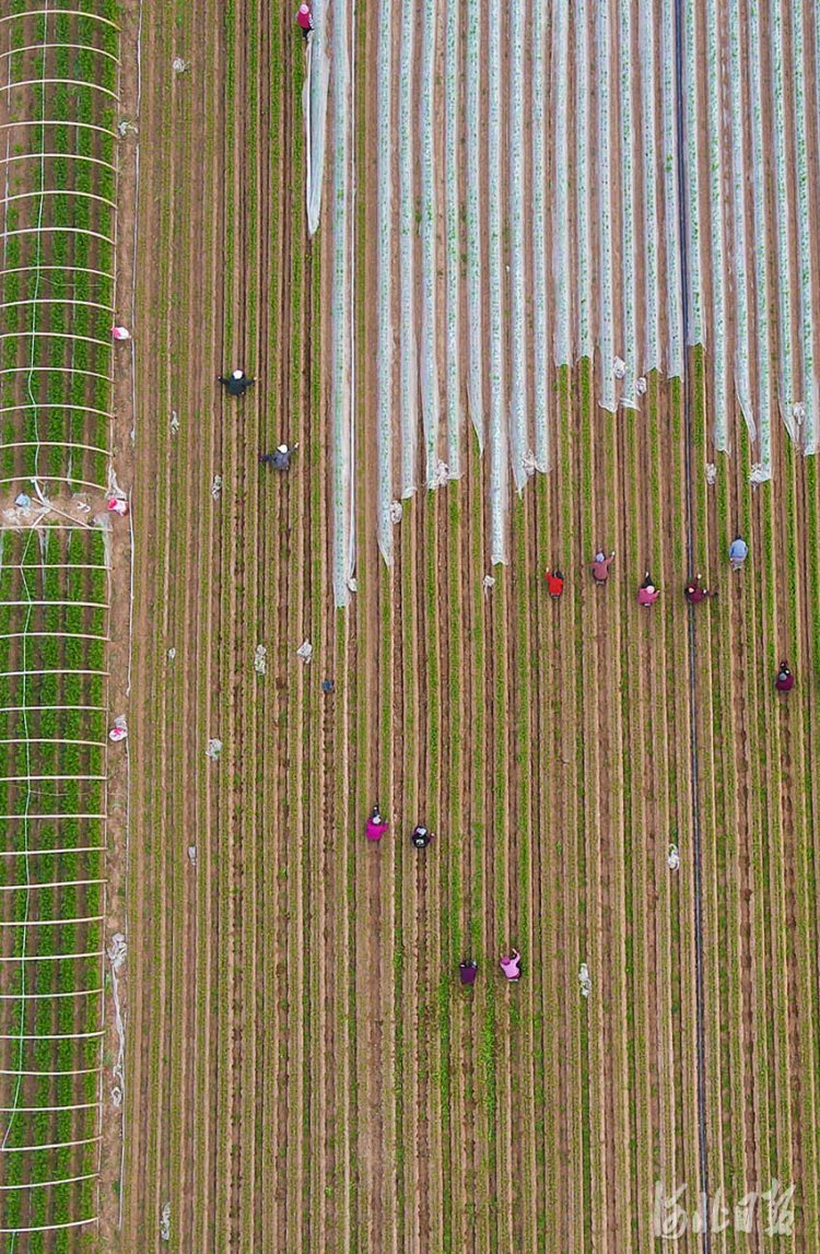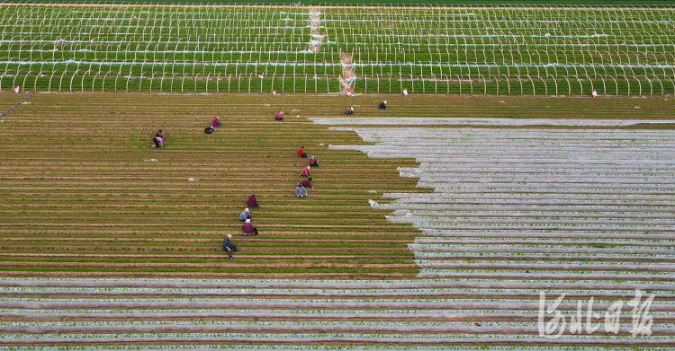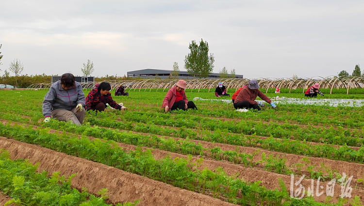 2022年4月15日,河北省宁晋县唐邱镇村民在卓荀家庭农场胡萝卜地疏苗。河北日报记者 赵永辉摄