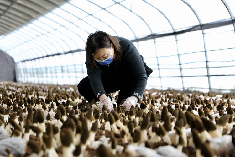 近日,在河北省宁晋县凤凰镇中曹村的犇腾家庭农场,大棚内羊肚菌长势喜人,农民在采收成熟的羊肚菌。河北日报记者 赵永辉摄