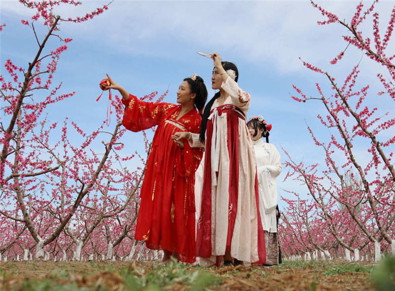 4月16日,在河北省固安县贾各庄村千亩桃园内,汉服爱好者赏花游玩。