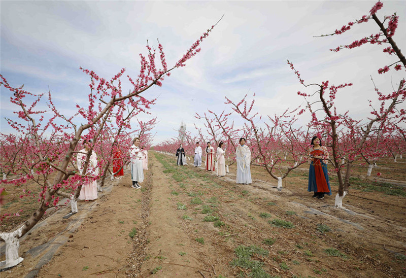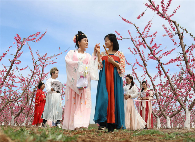 时下,正值春暖花开,河北省固安县贾各庄千亩桃园内桃花竞放,来自该县的汉服爱好者在桃花园上演一场“汉服秀”。