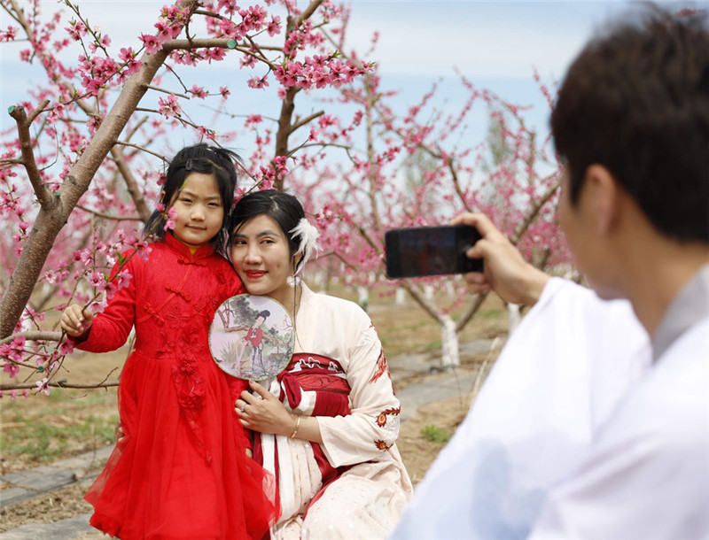 4月16日,在河北省固安县贾各庄村千亩桃园内,汉服爱好者拍照留念。