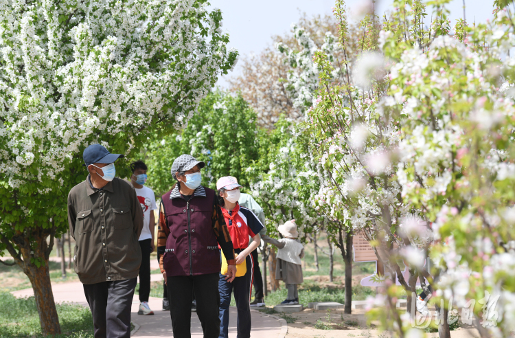 2022年4月24日,游客在河北省张家口市怀来县小南辛堡镇大古城村印象海棠公园赏花观景。通讯员 梁涛摄影报道