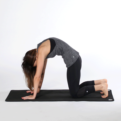 呼气,低头拱背,转动骨盆向下