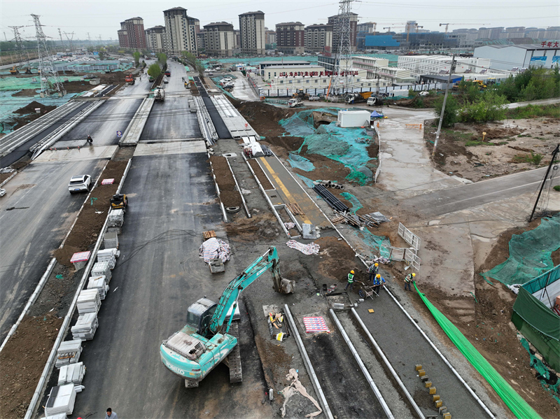 4月28日,中铁十一局的工人在雄安新区容西片区奥威路施工(无人机照片)。