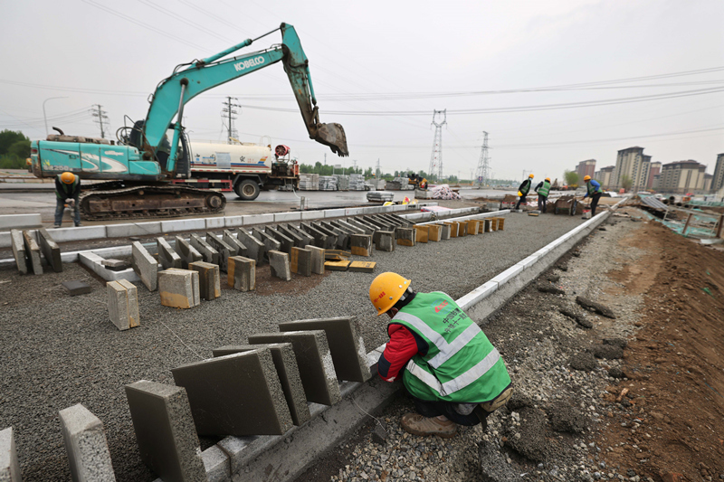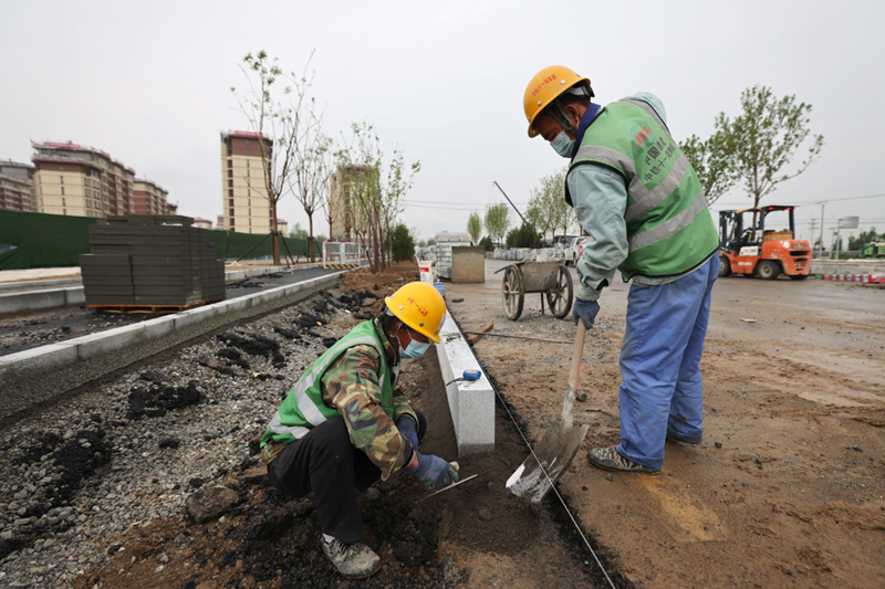 4月28日,中铁十一局的工人在雄安新区容西片区奥威路施工。