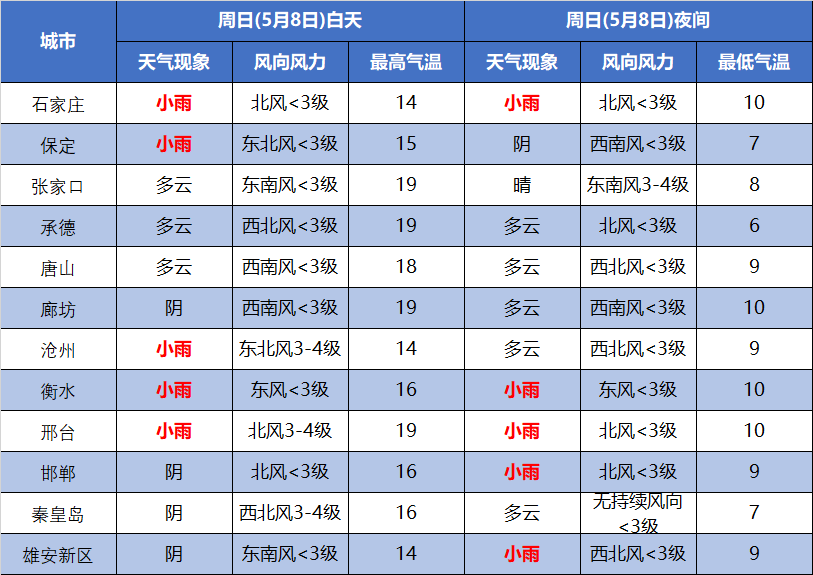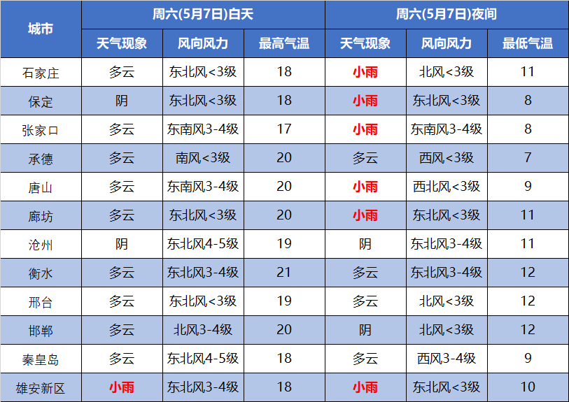 最高温度张家口、承德北部、保定西北部11~17℃,其他地区17~21℃。