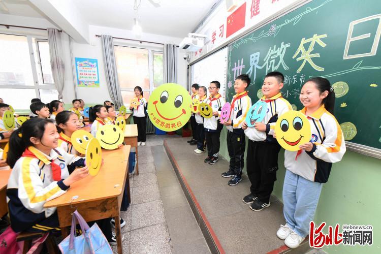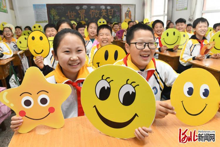 2022年5月7日,河北省石家庄新乐市实验小学的学生们手举笑脸卡做游戏。5月8日是“世界微笑日”,新乐市实验小学开展微笑进校园,快乐每一天活动,鼓励学生们用微笑面对学习和生活。 通讯员贾敏杰摄影报道