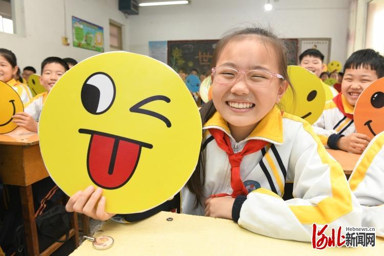 2022年5月7日,河北石家庄新乐市实验小学的学生们手举笑脸卡做游戏。通讯员贾敏杰摄影报道