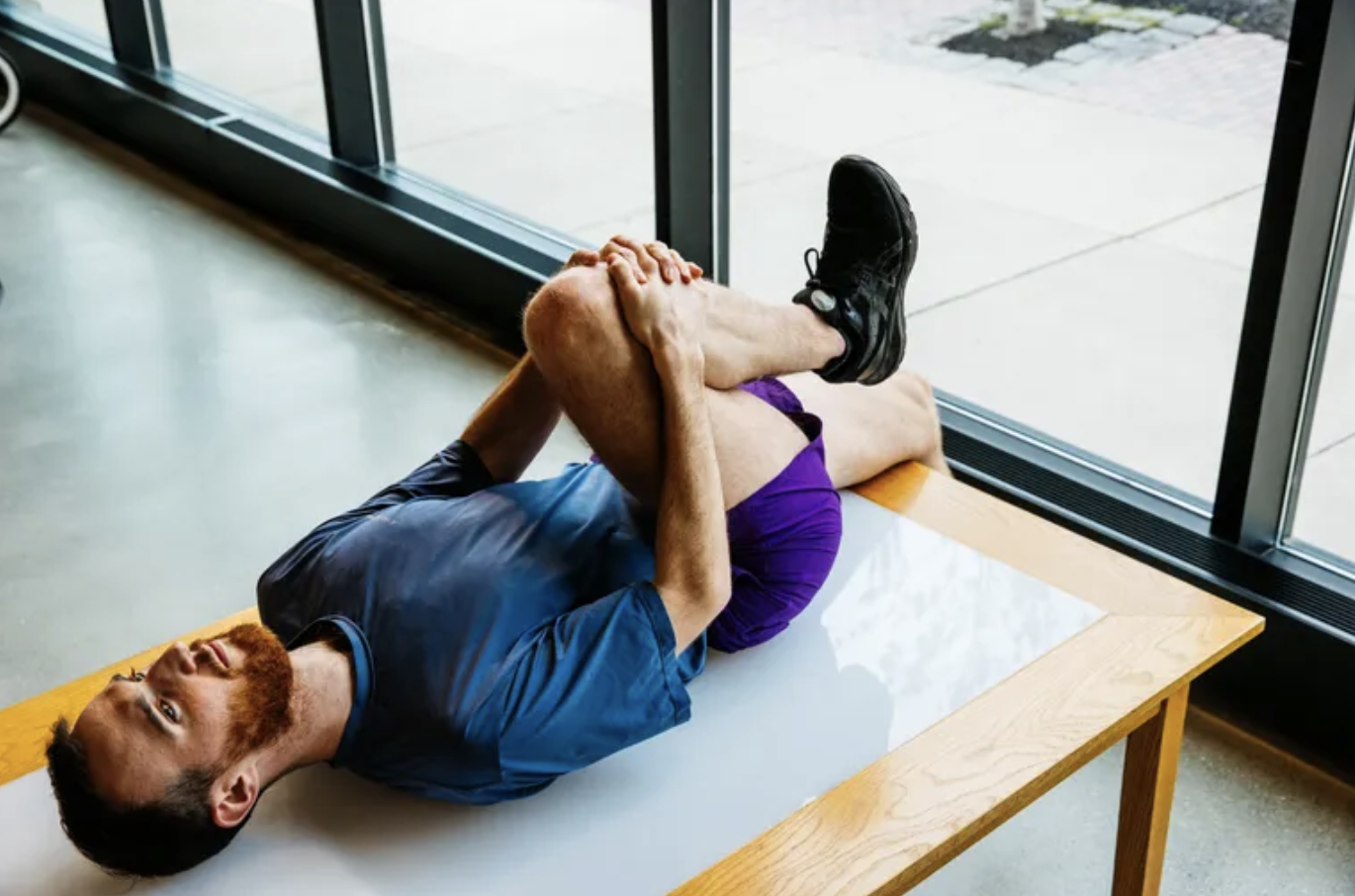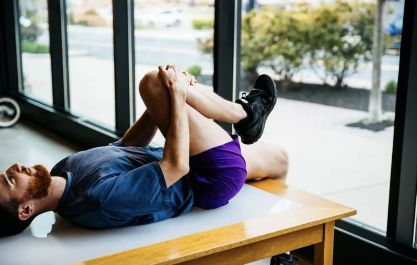 按照费雷拉医生的方法,这种运动治疗的方法是——将一只膝盖抱着提向胸腔位置,同时面朝上躺在床上或者桌面上,然后确保保持背部和另一侧大腿紧贴桌面和床,并保持膝盖弯曲成90度角。依靠核心肌群和髋屈肌发力来保持这个拉伸动作30秒到60秒。