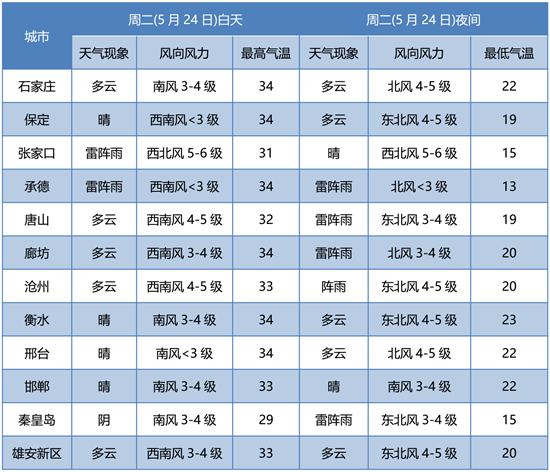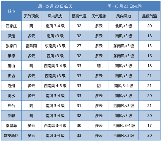 5月23日白天,张家口、承德北部和保定、石家庄、邢台三个地区的西部多云转阴有分散性雷阵雨或阵雨,其他地区多云。最高气温,张家口北部、承德北部24~29℃,其他地区30~33℃。