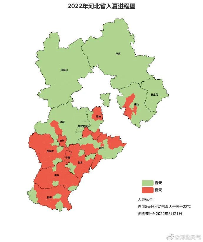 截止到5月21日,除了张家口、承德、秦皇岛,其它地区都已经陆续开启入夏进程。