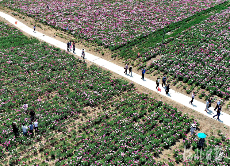 2022年5月22日,位于河北省秦皇岛市驻操营镇邹刘贺村的秦皇岛市上禾油用牡丹种植专业合作社示范基地内,游客在盛开的芍药花海参观游玩。(无人机照片)