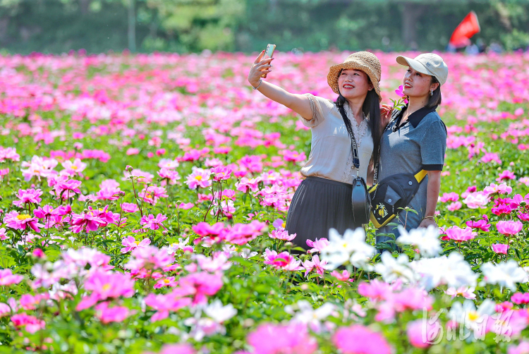 2022年5月22日,位于河北省秦皇岛市驻操营镇邹刘贺村的秦皇岛市上禾油用牡丹种植专业合作社示范基地内,游客在盛开的芍药花海参观游玩。