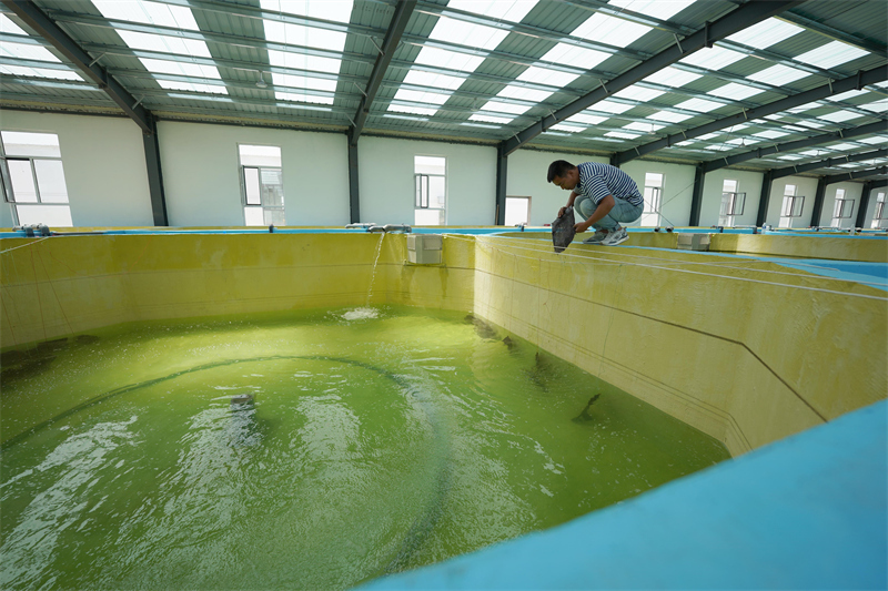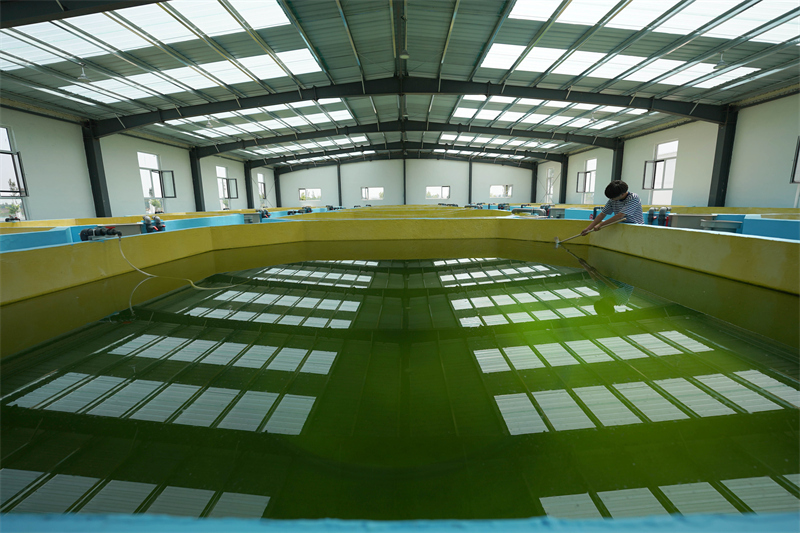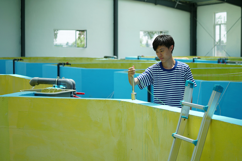 5月25日,在河北省沙河市冀庄村的淡水鲈鱼养殖基地,养殖户查看淡水鲈鱼鱼卵。