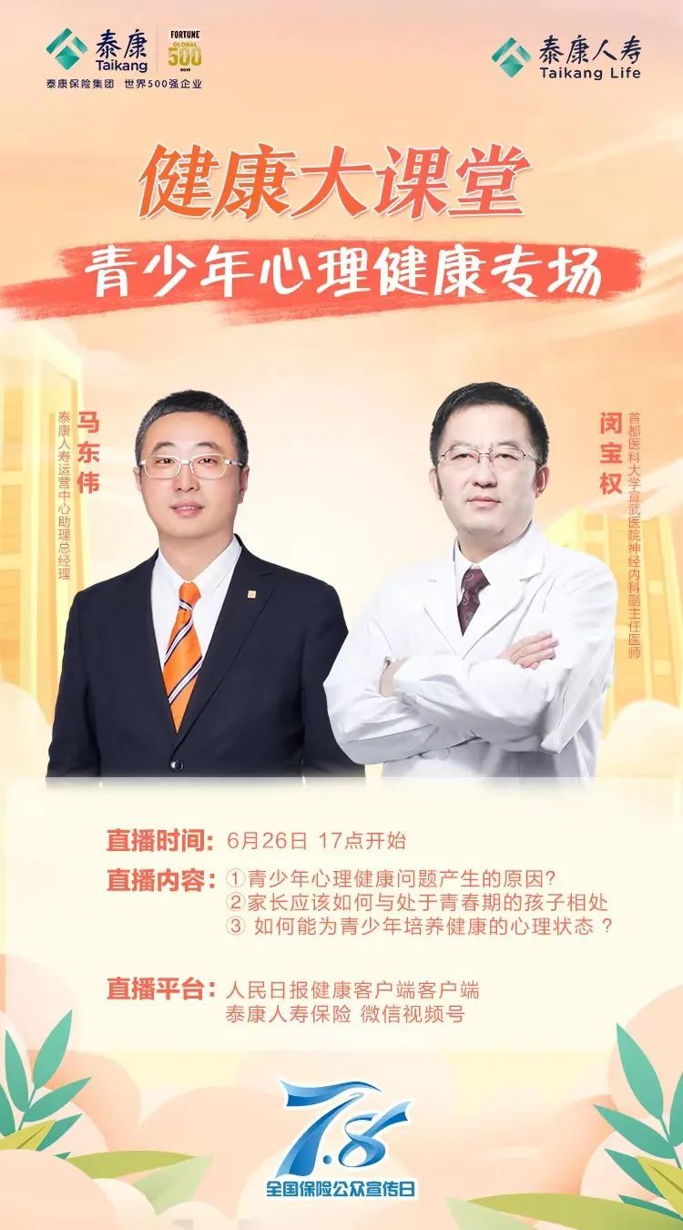 探索“保险+健康管理”模式,助力客户健康管理。泰康人寿依托旗下泰康医生APP,推出泰活力健康促进计划。加入该计划后,用户通过长期参与健康活动,获得健康知识、强身健体,长期医疗险客户还可通过积累健康值,享受续保优惠。今年以来,泰活力计划已为用户提供超1200万次健康服务,其中45.5%的用户已养成长期健康生活习惯。本次宣传日活动期间,泰活力计划将在7月8日发起“全民健步走,健康常相伴”主题公益活动,让更多客户享受健康管理服务。新冠疫情期间,泰康医生APP累计为客户提供线上问诊服务超158万次,服务满意度达97%。