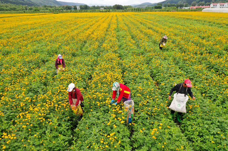近年来,围场县结合当地生态环境优势,积极调整农业种植结构,大力发展金莲花种植产业。同时,通过引入金莲花深加工企业,加大科研力度,打造金莲花颗粒、茶、饮片等产品,形成金莲花种植、研发、加工、销售为一体的产业链条,促进金莲花产业提档升级,助力乡村振兴。新华社发(王立群 摄)