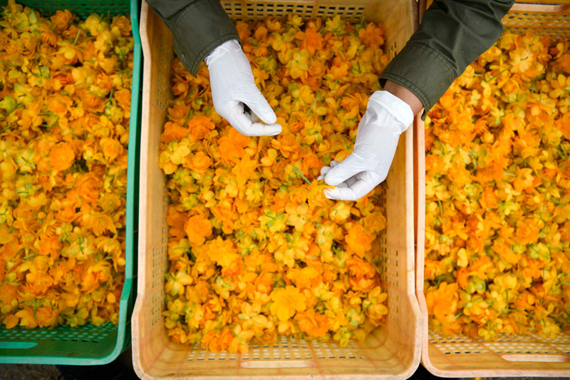 7月6日,在围场县一处金莲花种植基地,花农在挑拣金莲花。