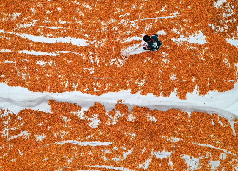 7月6日,在围场县一家药业公司,工人在晾晒金莲花。