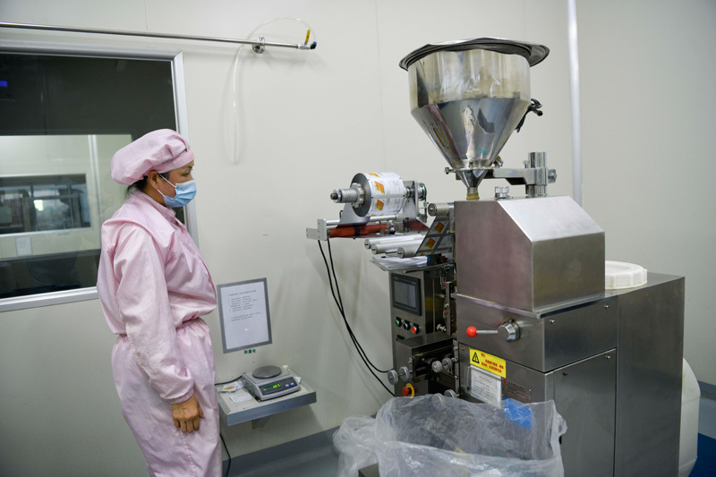 7月6日,在围场县一家药业公司,工人在金莲花颗粒产品生产车间工作。