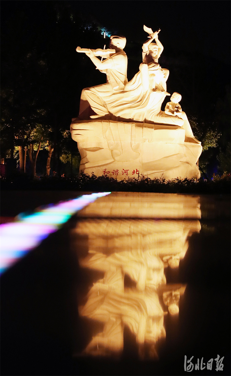 灯光亮起,河北正定园博园里的雕塑倒影成趣,展示出别样的韵味。