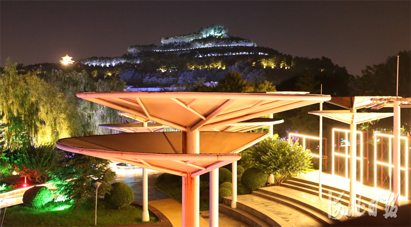 灯光下,河北正定园博园里独特的艺术造型建筑呈现出别样的情调。