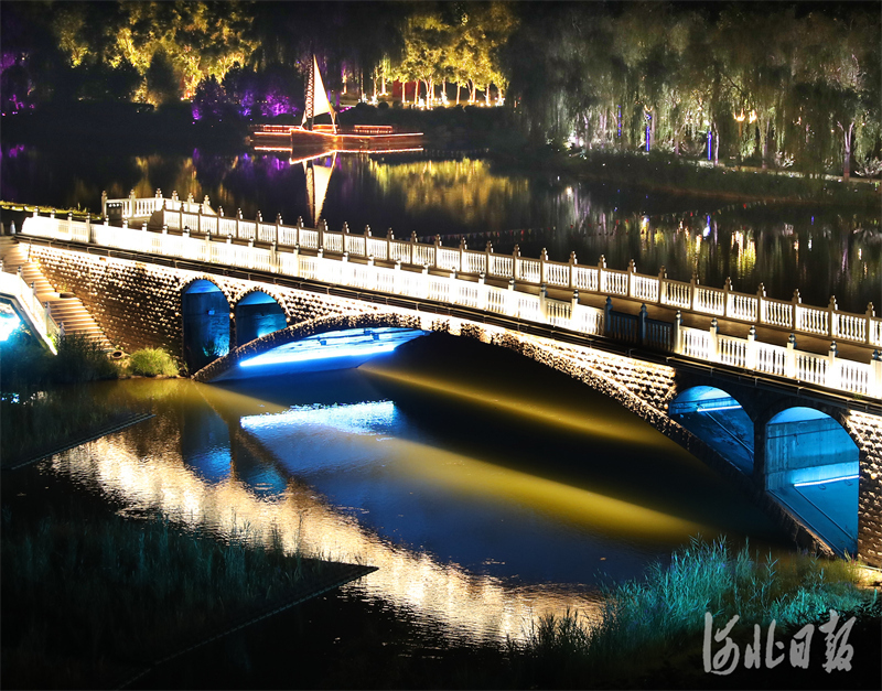 河北正定园博园里各色灯光照亮桥体,流淌着古韵之美。
