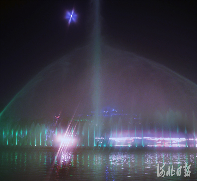 2022年7月7日,河北正定园博园里的音乐喷泉在灯光的映衬下,姿态万千。