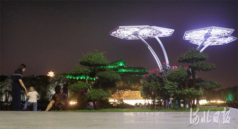 夜色中,人们在河北正定园博园里纳凉赏景。