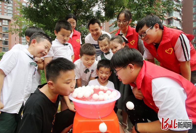 日前,邯郸市“返家乡”大学生在永年区梦湖社区新时代文明实践站开展公益托管进社区活动。图为志愿者和小朋友正在进行吹乒乓球比赛。 通讯员胡高雷摄