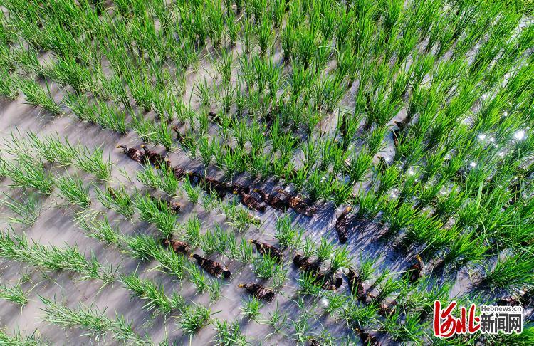 2022年7月28日,河北省张家口市怀来县大黄庄镇朱官屯村稻怀生态家庭农场“稻鸭共生”基地,鸭子在稻田中游弋觅食。