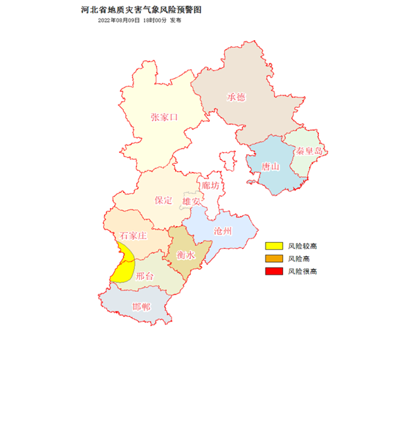 自8月9日20时至8月10日20时,石家庄市(元氏县、赞皇县、井陉县)、邢台市(临城县、内丘县、沙河市、信都区)发生崩塌、滑坡、泥石流等地质灾害风险较高(黄色预警)。上述地区有关责任单位和监测人员要做好地质灾害监测、巡查、转移避险等防范工作。
