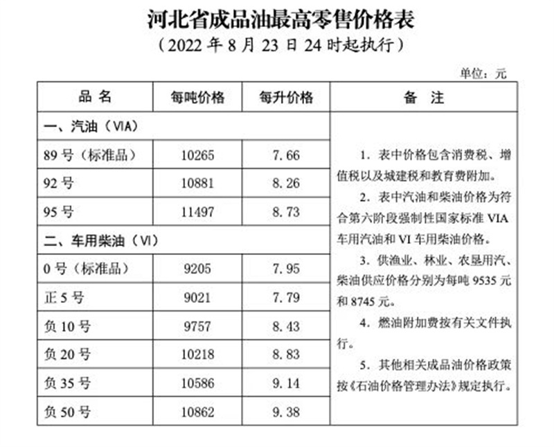 原标题:8月23日24时起,河北汽、柴油价格下调