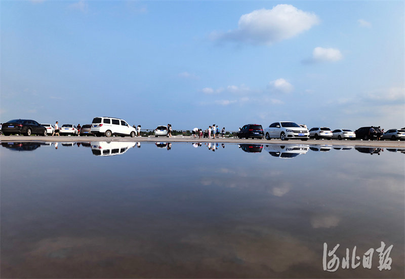 2022年7月10日,蓝天白云下,省城市民在滹沱河畔游玩。