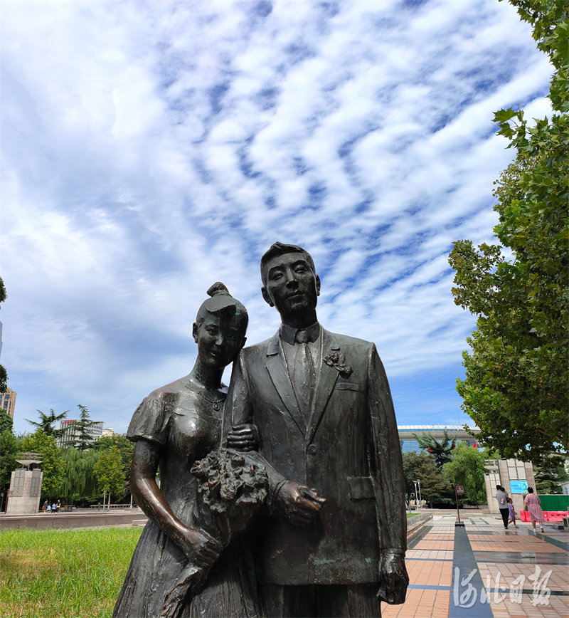 2022年8月22日,省城石家庄白云飘飘,人民广场的雕塑“欣赏”眼前风景。
