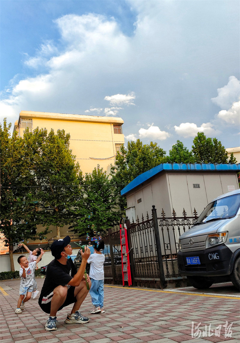 2022年9月5日,蓝天白云下,省城市民在华新园小区玩耍。