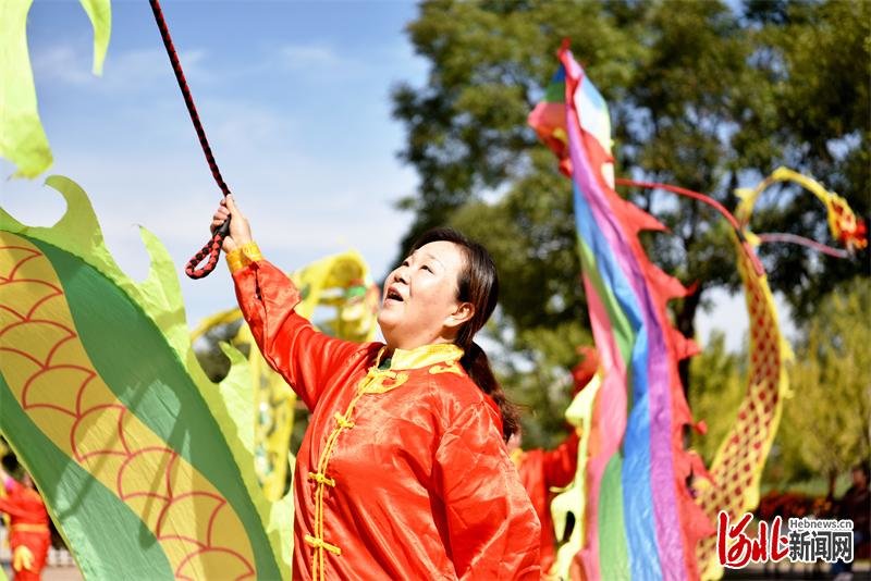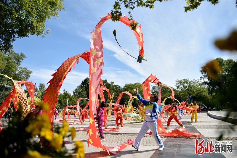 9月24日,张家口市宣化区文艺爱好者们自发组成表演队伍,走上街头、游园、广场,用热烈欢快的舞龙、挎鼓、舞蹈等表演形式,营造浓厚的喜庆氛围,共迎国庆节的到来。河北日报通讯员陈晓东摄