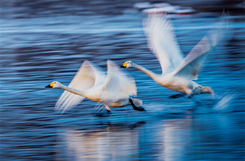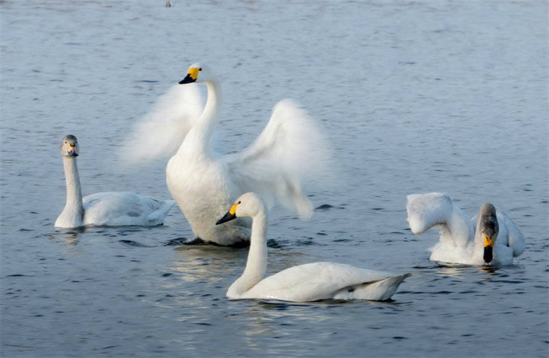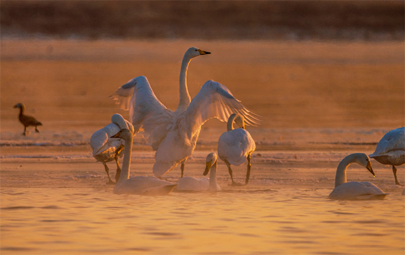 秋冬之交,河北省张家口市宣化区洋河湿地迎来南迁白天鹅。新华社发(陈晓东 摄)