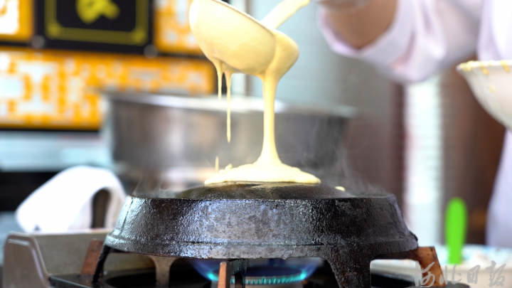 倒入特制的圆形铁锅上慢火烙制