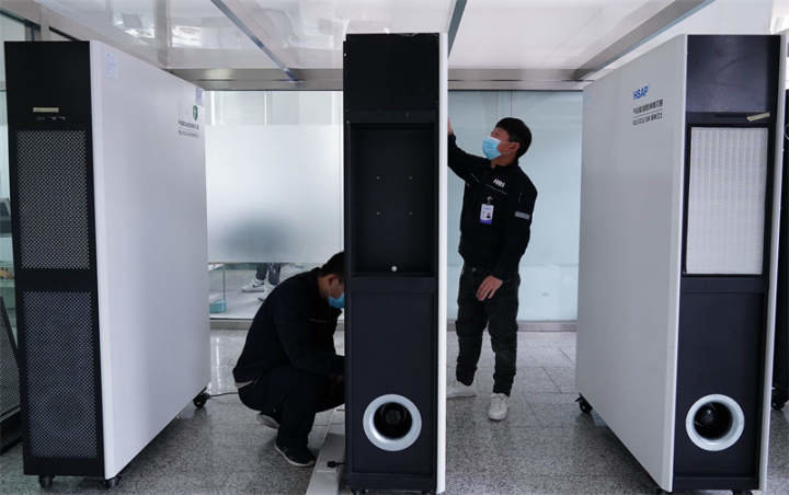 气溶胶吸附消毒灭菌系统设备在秦皇岛研制成功。图为工作人员在调试气溶胶吸附消毒灭菌系统设备。