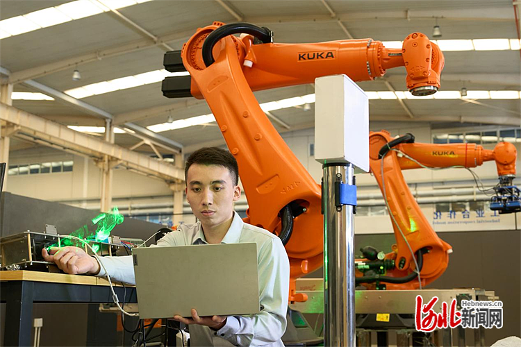 河北鹰眼智能科技有限公司创始人袁鵾正在调试机器人激光视觉扫描设备。卢嘉德摄