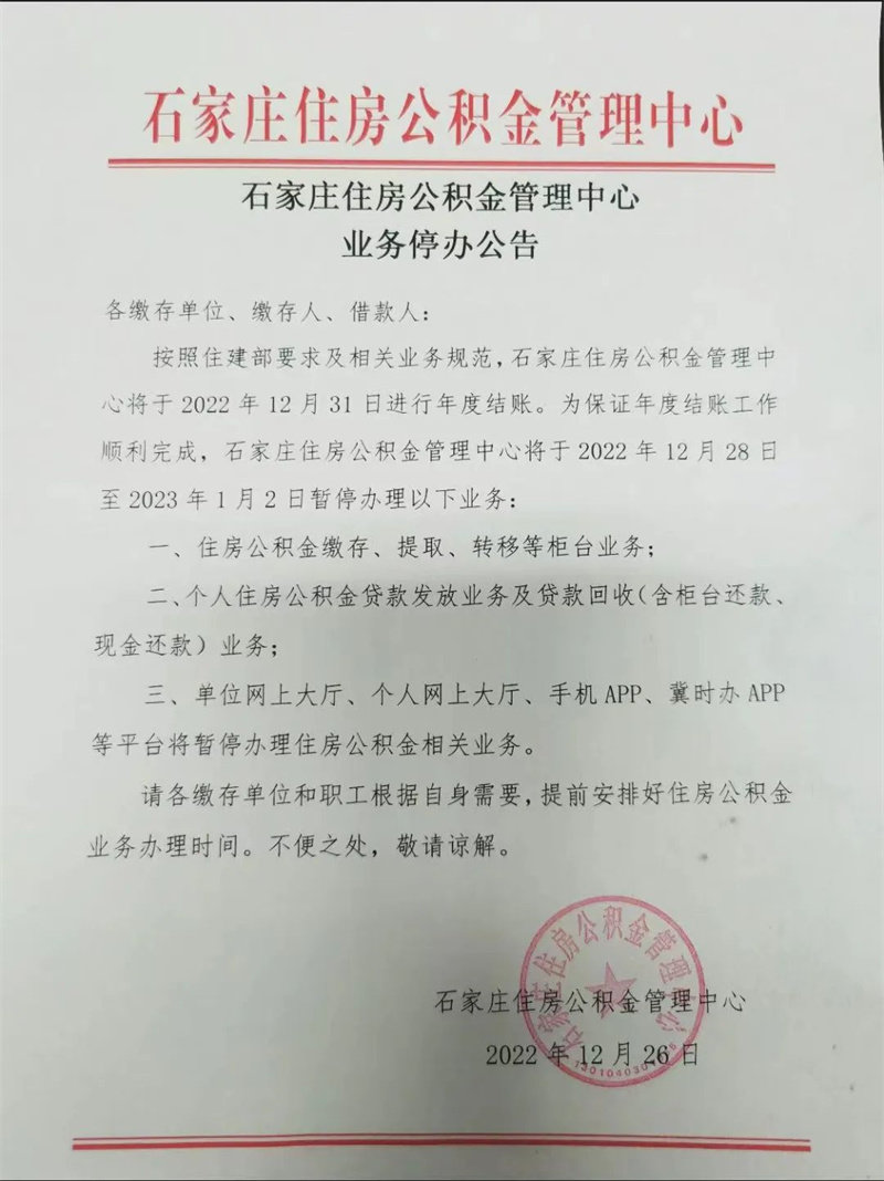 一、2022年12月30日全市各业务网点暂停办理住房公积金所有业务,工作日期间前台业务窗口正常开展政策咨询。