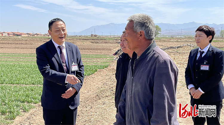 李海明(左一)在蔚县代王城镇马家碾村田间走访村民。 蔚县信访局供图