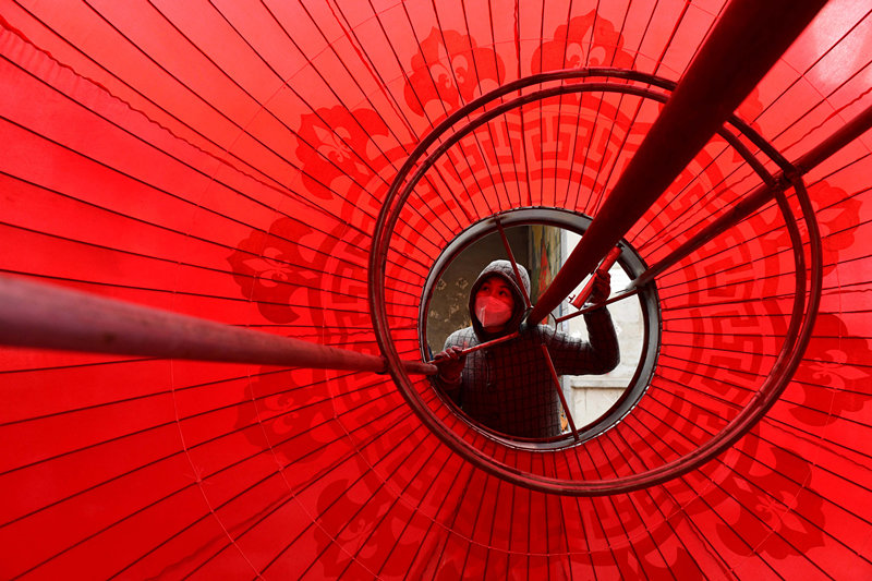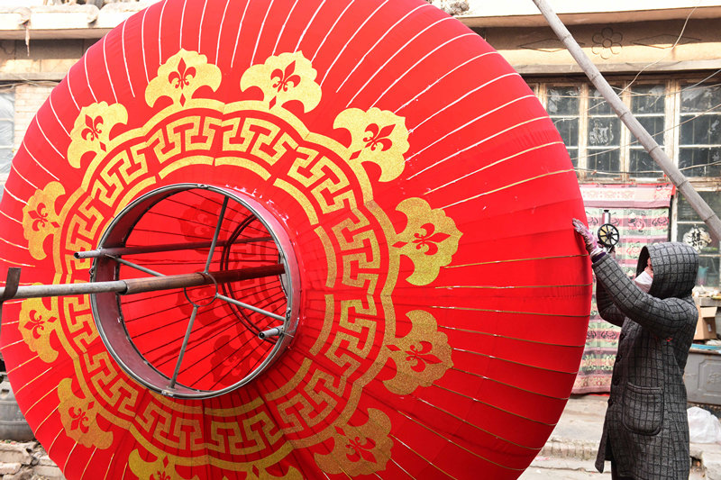 1月5日,在河北省石家庄市藁城区屯头村,一家宫灯企业的工人制作大型宫灯。新华社发(陈其保 摄)