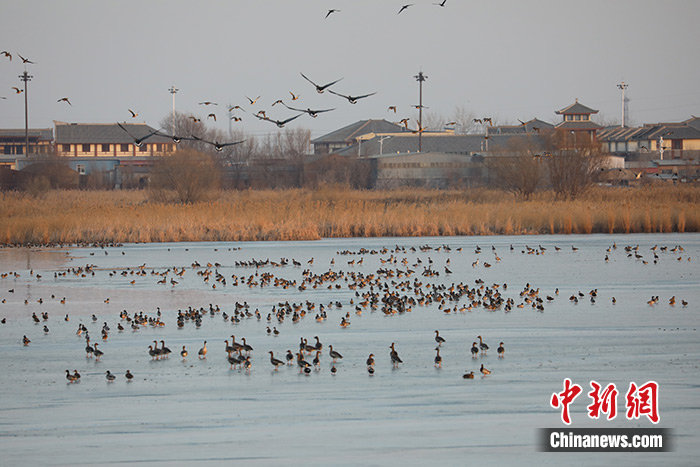 1月的“京津冀最美湿地”河北衡水湖,湖面开始结冰,那些本该向南迁徙的冬候鸟并未飞走,显得“乐不思蜀”。图为1月9日,衡水湖大群的豆雁。 中新社发 张余广 摄