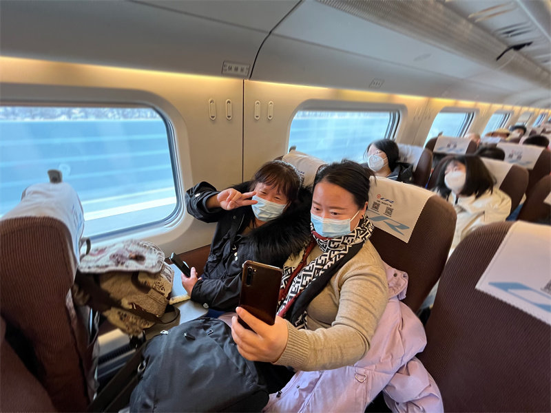 1月23日,唐山市民李盼盼(前排右)和姑姑李春英(前排左)乘坐京唐城际铁路前往北京旅游。车厢内,两人开心地自拍。河北日报记者师源摄