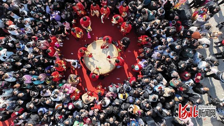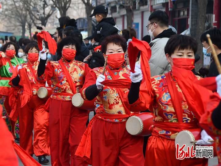 在新乐市文化广场,化皮村民间艺人正在进行战鼓表演。元宵节到来之际,当地开展舞龙、锣鼓表演、舞狮等丰富多彩的民俗活动欢庆佳节。