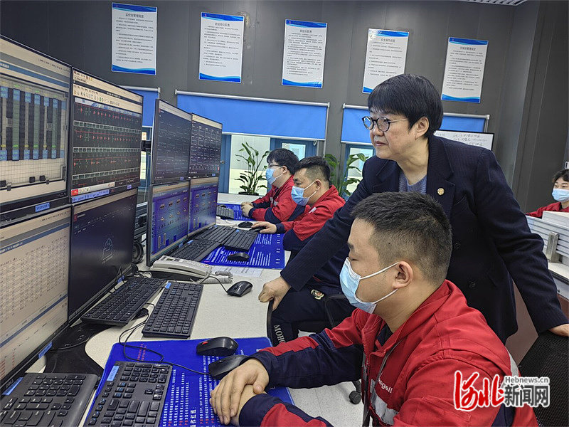 2月15日上午,在润泽国际信息港A2数据中心,周超男(右二)正在监控中心大屏幕前,查看数据中心的运行状况。河北日报记者 解丽达摄